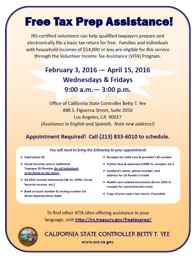 Ca State Controller On Twitter Free Vita Tax Prep Appointments Available At The Controller S Office In Downtown La Call 213 833 6010 To Schedule Https T Co R0q1rwdfye Twitter